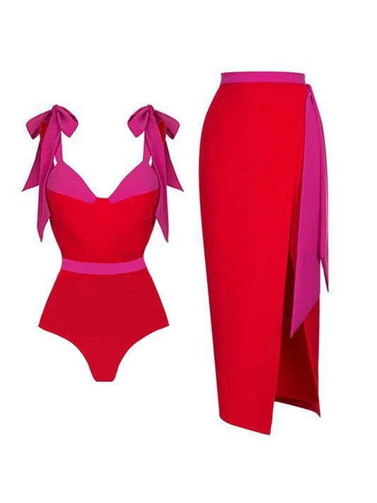 Floral Appliqué Swimsuit Skirt Set