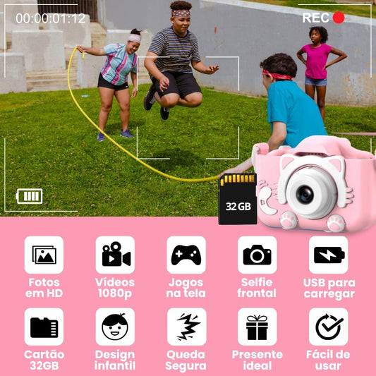 Câmera Digital Infantil 1080p + Cartão MicroSD 32 GB Incluso – Portátil, Recarregável, Tela LCD, Games, Antichoque – Presente Educativo para Crianças (Rosa)